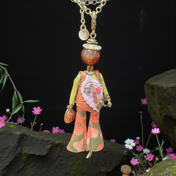Unique  Handmade in Paris Frace Diva Doll necklace with 30” Gold chain.  Each doll is uniquely dressed featuring a natural stone or pearl head. They each carry a charm or handbag. The doll pendant is detachable. A unique girly gift loved by diva ladies of all ages.