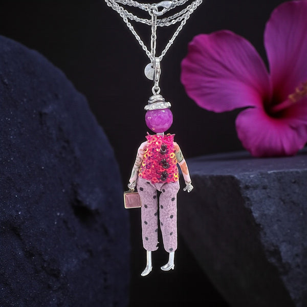 Unique Handmade in Paris France Diva Doll necklace with 30” Gold chain. Each doll is uniquely dressed featuring a natural stone or pearl head. They each carry a charm or handbag. The doll pendant is detachable. A unique girly gift loved by diva ladies of all ages.
