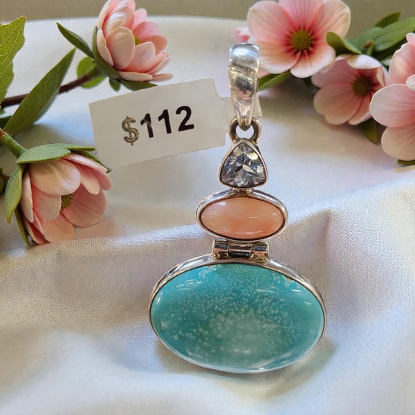 Turquoise, Blue Topaz, Pink Coral Sterling Silver Pendant Three powerhouse stones unite in one stunning pendant. Turquoise awakens intuition and encourages honest communication, while blue topaz amplifies clarity and calm focus. Pink coral brings warmth, compassion, and emotional healing to the mix. Together, they create a tri-stone symphony of good vibes wrapped in polished sterling silver. Whether you're seeking a confidence boost, emotional support, or simply love the gorgeous ocean-inspired palette, this pendant delivers on both style and substance. Layer it with your favorites or let it shine solo—either way, you're wearing a little piece of crystal magic.