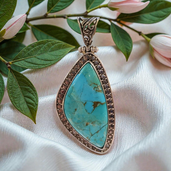 Turquoise Sterling Silver Pendant This striking turquoise pendant is your ticket to better vibes and bolder self-expression. Turquoise has been treasured for centuries as a stone of protection, truth-telling, and spiritual connection—helping you navigate life with confidence and authenticity. Nestled in gleaming sterling silver, it's a piece that looks as good as it feels. Perfect for anyone seeking a little extra courage, enhanced intuition, or simply a pop of that gorgeous blue-green magic around their neck. Wear it as your daily dose of good energy or pass it along to someone who deserves a little extra sparkle and support.